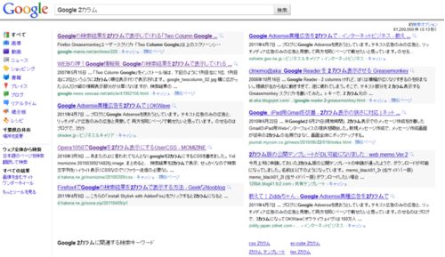 こちらの「install Stylish with AddonFox」をクリックすると2カラムになると思います。 Google Search - Multi Column - Themes and Skins for google.co.jp - userstyles.org http://userstyles.org/styles/27918/ 私はStylishなどの特別なアドオンをイン…