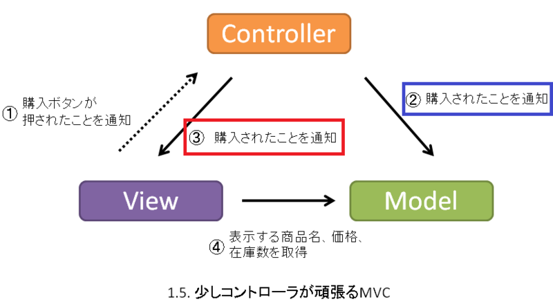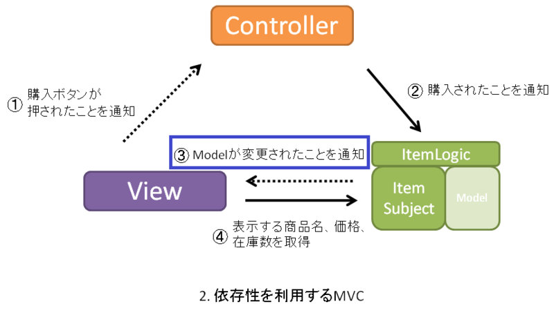 - c. モデルの変更Viewに通知します。(図の3購入されたことを通知 C→V)←ここが頑張っているポイント